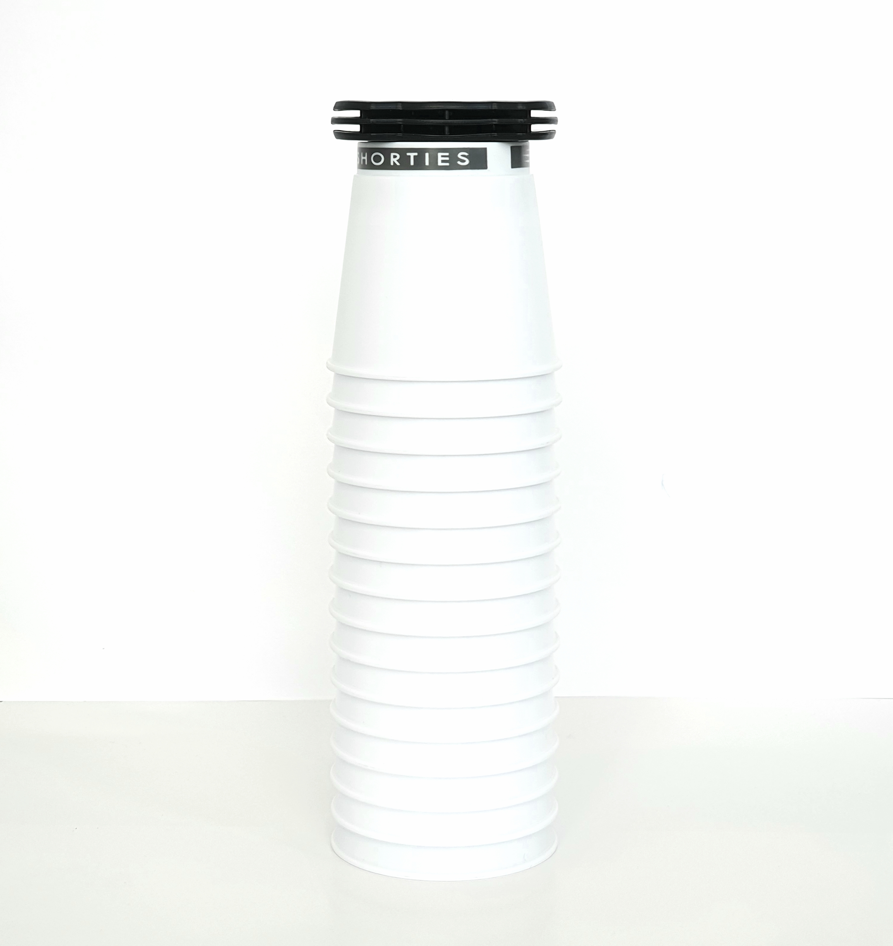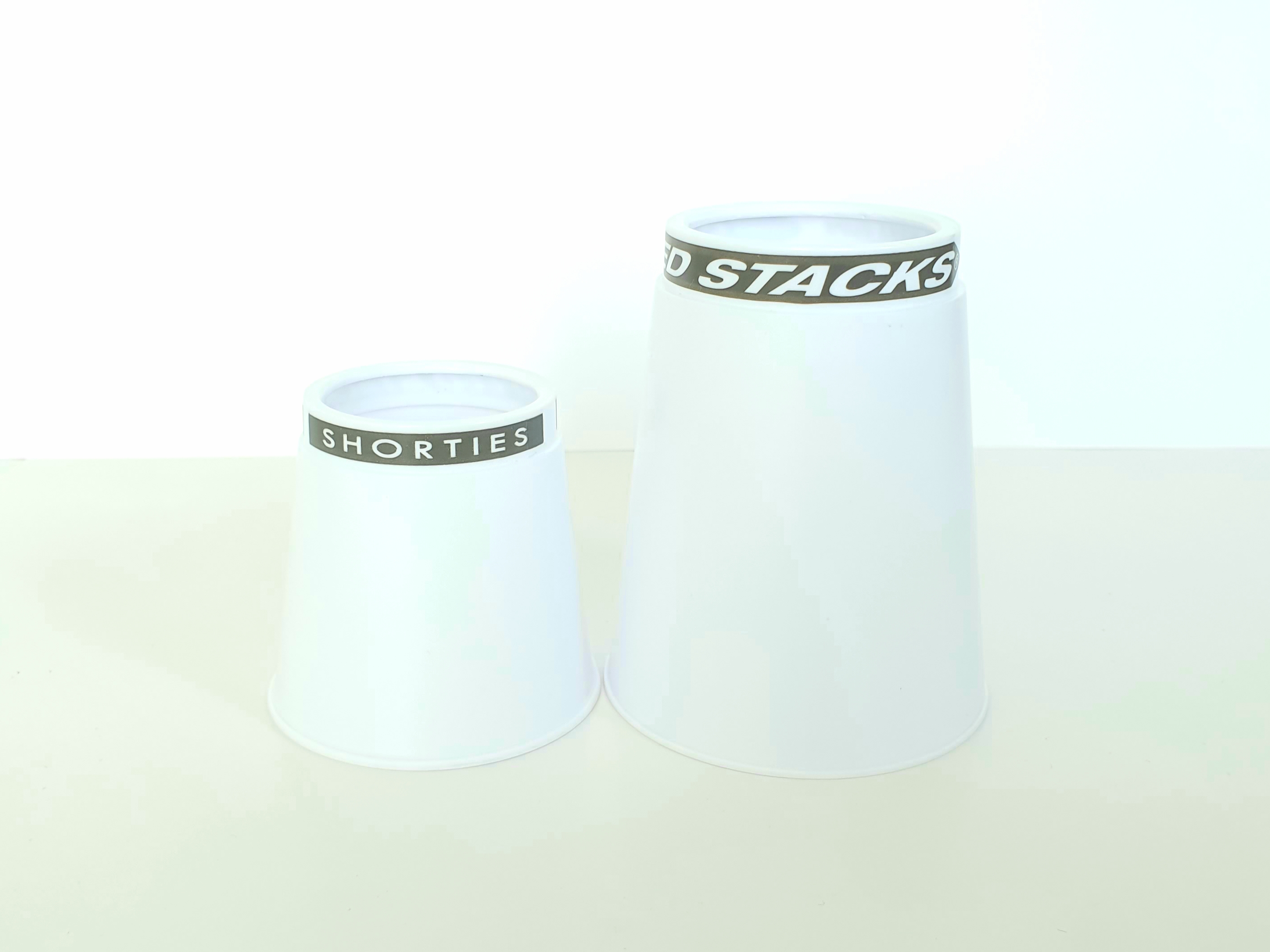 Shorties are an exciting new, lightning fast mid-size cup. While still big enough to grip with the whole hand, their shorter height means they can be stacked much faster so expect record times with these cups (no, they cannot be used in competition yet, but a new category may be created in the future). Younger stackers will also welcome Shorties because they are easier to hold with smaller hands. Even more exciting is that Shorties come with 15 cups in each set, which opens up a whole new world of stacking patterns! Shorties are a Pro Series style, open top cup and come with a Shorties Stem that securely holds all 15 cups. The inaugural edition of Shorties are white with charcoal step printing to reduce printing wear.